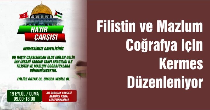 İlçemizde gelirleri Filistin halkının haklı direnişine destek olmak amacıyla kullanılacak olan; çeşitli yemeklerin, hediyelik eşyaların satılacağı kermes düzenlenecek. İlçemiz gönüllüleri...