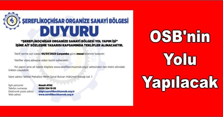 İlçemiz Organize Sanayi Bölgesi’nin yolu yapılacak. OSB Bölgesi içine yapılacak olan yol yapımı, ihale ile yapılacak. Yol yapımı işi işine...
