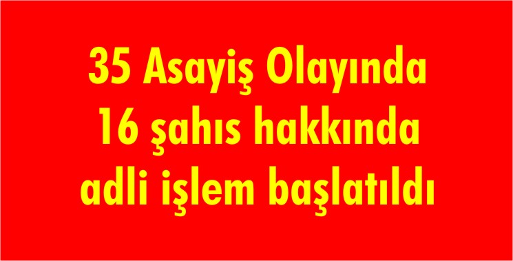 İlçe Emniyet Müdürlüğü Sorumluluk Bölgesinde meydana gelen 29 olayla ile ilgili olarak olaylara karışan 16 şahıs yakalanmış olup şahıslar hakkında adli işlem başlatıldı.