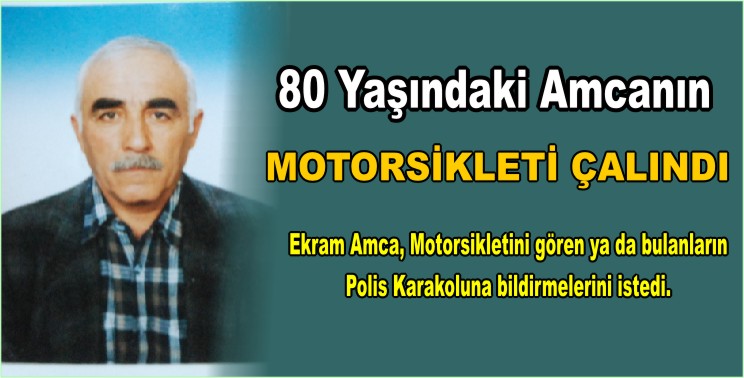 Aslen Bağobası mahallesinden olan 80 yaşındaki Ekrem Koçak Amcanın, motosikleti Cumartesi pazarında hırsız ya da hırsızlar tarafından çalındı. Daha önce hızarcılık yapan ve hızarcı Ekrem diye de bilinen Ekrem Amca, motosikletini görenlerin ve bulanların 05363382265 nolu telefondan kendisine ulaşmalarını istedi.