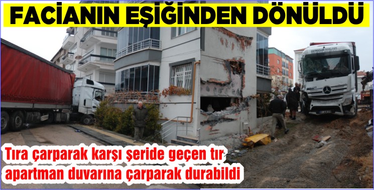 Pazartesi gününü Salı gününe bağlayan gece yarısı meydana gelen tır kazası hem sürücülere hem de apartman sakinlerine korku dolu anlar yaşattı. Solladığı tıra çarparak kontrol çıkan tır sürücü önce karşı şeride geçti, daha sonra binaya çarparak durabildi. Tırın apartmanın balkon kısmına değil köşesine çarpması olası daha büyük faciayı önlemiş oldu.