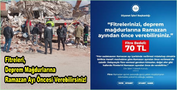 2023 yılı fitre bedelini 70 TL olarak belirleyen Din İşleri Yüksek Kurulu, deprem mağdurları için fitrenin Ramazan ayından önce de verilebileceğini açıkladı. Ramazan-ı Şerifte verilecek olan Fitrenin Deprem mağdurlarına önceden verilecek olması haberini duyan vatandaşlarımız Fitrelerini ilçemizde bulunan depremzedelere vermeye başladı.