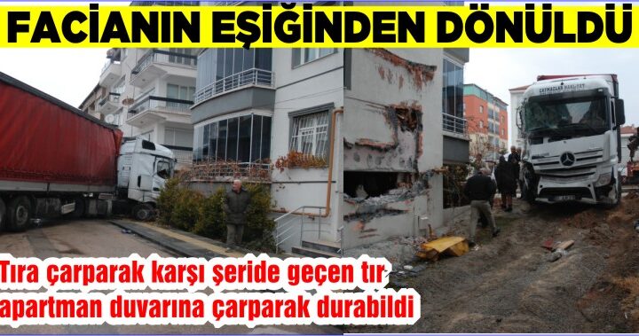 FACİANIN EŞİĞİNDEN DÖNÜLDÜ Tıra çarparak karşı şeride geçen tır, apartman duvarına çarparak durabildi