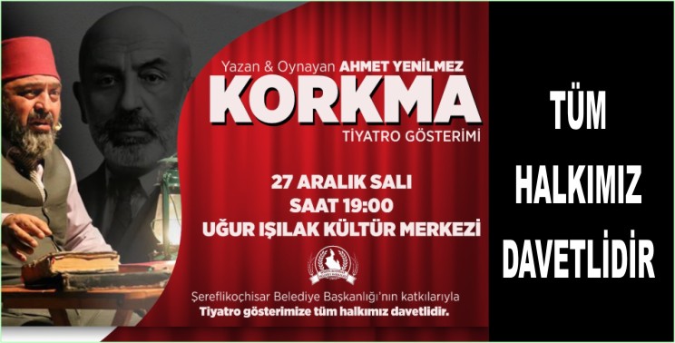 Sinema, dizi ve tiyatro oyuncusu Ahmet Yenilmez’in Milli Şair Mehmet Akif Ersoy’un hayatından kesitleri ve Çanakkale destanını anlatan “Korkma” isimli tek kişilik ve tek sahnelik oyunu, sahnelenecek.