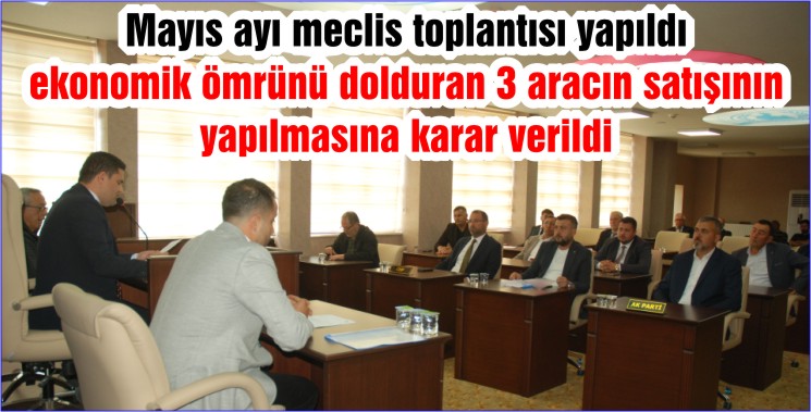 Mayıs ayı meclis toplantısı yapıldı. CHP Meclis Üyesi Savaş Yiğit’in izinli olarak katılmadığı meclis toplantısında 4 gündem, 1 gündem dışı olmak üzere 5 gündem maddesi görüşüldü. Meclisten alınan karara göre İlçemiz Belediyesine ait ekonomik ömrünü dolduran 3 aracın satışının yapılmasına karar verildi.