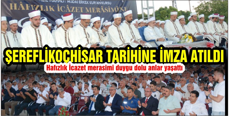 İlçe Müftülüğü tarafından hazırlanan gerek içeriği, gerek konuşmacıları gerekse dünyaca ünlü hocaların katıldığı Hafızlık İcazet merasiminde duygu dolu anlar yaşandı. Yaklaşık 2 bin kişinin katılmış olduğu merasim Şereflikoçhisar’ın tarihine altın harflerle imza atıldı.