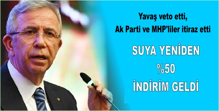 Eylül Ayında yapılan Ankara Büyükşehir Belediyesi Meclis Toplantısında Ak Parti ve MHP’li Meclis Üyelerinin vermiş olduğu önerge ile suya %50 indirim yapılması kararı alınmıştı. Kararı veto eden ABB Başkanı Mansur Yavaş’a karşı Ekim Ayı Meclis Toplantısının 1. Birleşiminde Ak Parti ve MHP’li Meclis üyeleri yeniden itiraz etti. CHP ve İP ise önergeye ret oyu vermesine rağmen, Karar oy çokluğu ile kabul edildi. Böylelikle Yavaş’ın ikinci kez veto etme hakkı bulunmadığından Ankaralılar suyu yüzde 50 indirimli kullanabilecek.