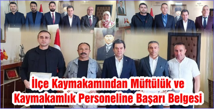 Geçtiğimiz günlerde İlçe Kaymakamı Taner Tengir tarafından verilen başarı belgesinde, Kaymakam, özverili ve gayretli çalışmalarından dolayı başta ilçe Müftüsü Fatih Balta olmak üzere personelini tebrik ederek, çalışmalarında başarılar diledi. Başarı belgesini alan Müftülük çalışanları yıllar sonra İlçe Kaymakamı tarafından böyle anlamlı bir belge aldıkları için çok mutlu olduklarını ifade ederek, Kaymakam Taner Tengir’e teşekkür ettiler.