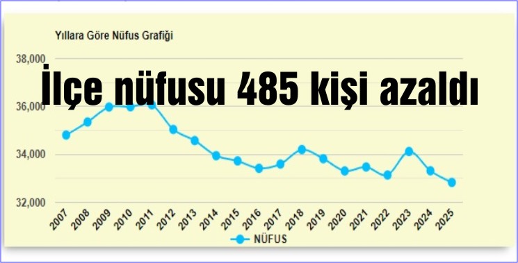İlçemizin nüfusu 2025’te bir önceki yıla göre 485 kişi azaldı. 2024 yılında 33 bin 316 olan nüfus 2025 yılında 485 kişi azalarak 32 bin 831’e düştü. İlçe nüfusunda önemli bir nokta ise kadın nüfusundaki düşüş oldu. 2024 yılında erkek sayısından fazla olan kadın nüfusu 2025 yılında erkek sayısından daha az çıktı. İlçemizin en çok nüfusa sahip merkez mahallesi 4283 sayısı ile İstiklal Mahallesi olurken, en çok kalabalık dış mahallesi ise 421 sayısı ile Çalören Mahallesi oldu.